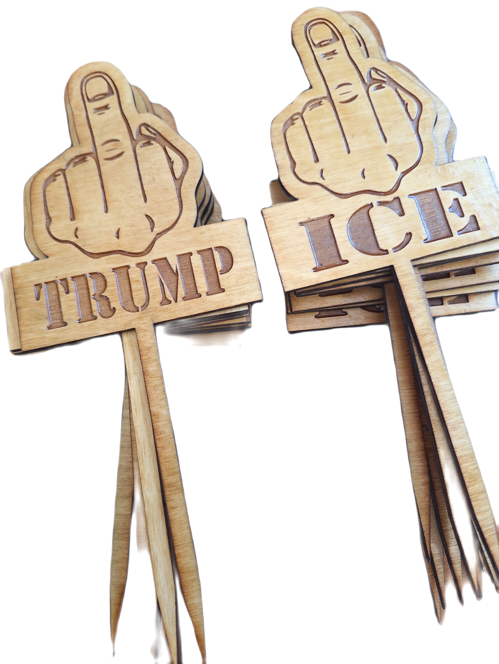 Features a middle finger and Trump or a middle finger and ICE
